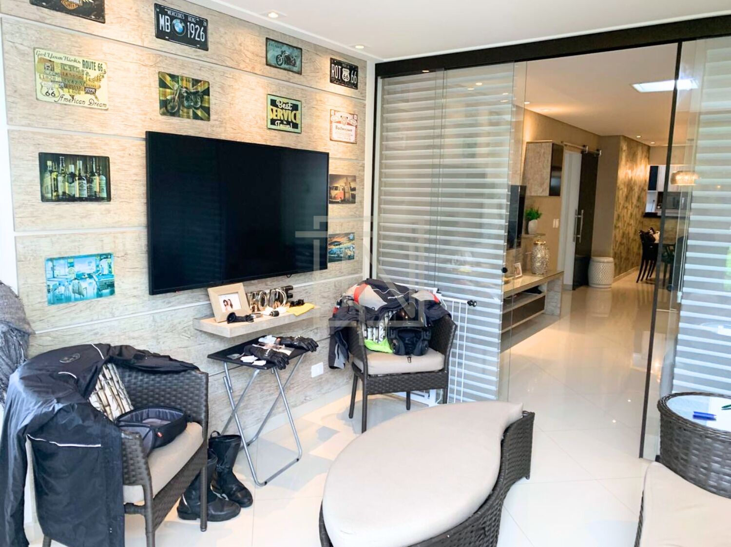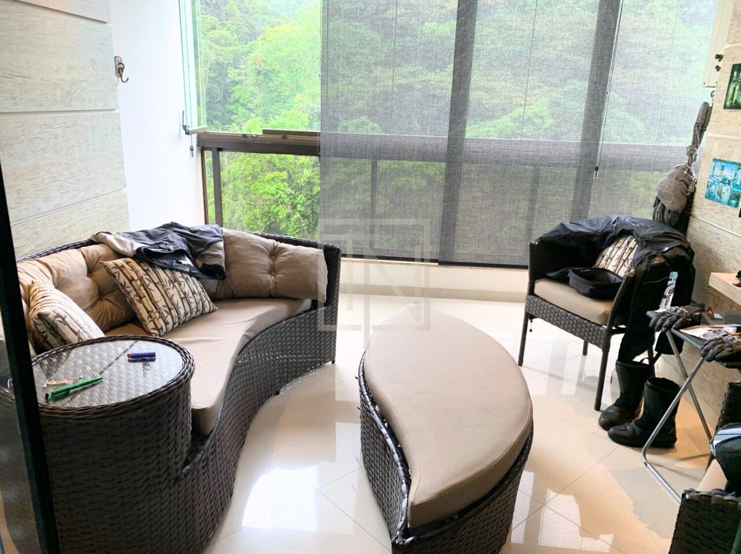 A ampla varanda envidraçada oferece um espaço aconchegante para relaxar, aproveitando a vista permanente da Mata Atlântica com segurança e conforto.